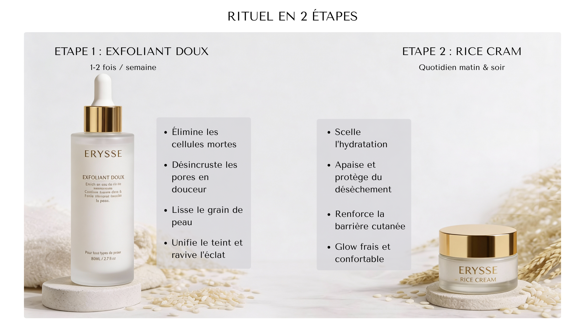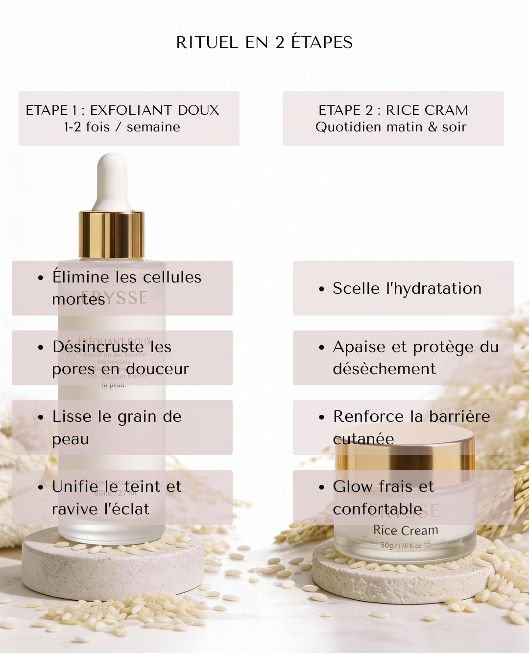 Le Rice Ritual Trio est composé d’un Exfoliant Doux (80 ml) et de deux Rice Cream (50 g) pour un rituel complet inspiré de la K-Beauty : libérer les pores, puis sceller l’hydratation… et prolonger le confort jour après jour.